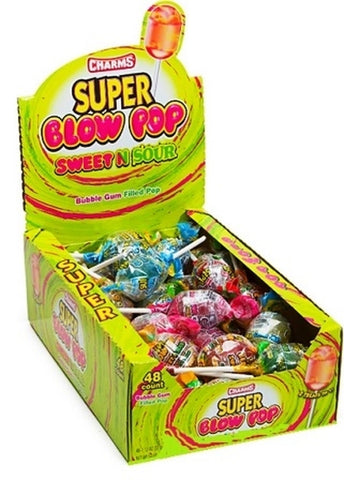 Display box contains 48 Charms Super Blow Pops Sweet N Sour Suckers.